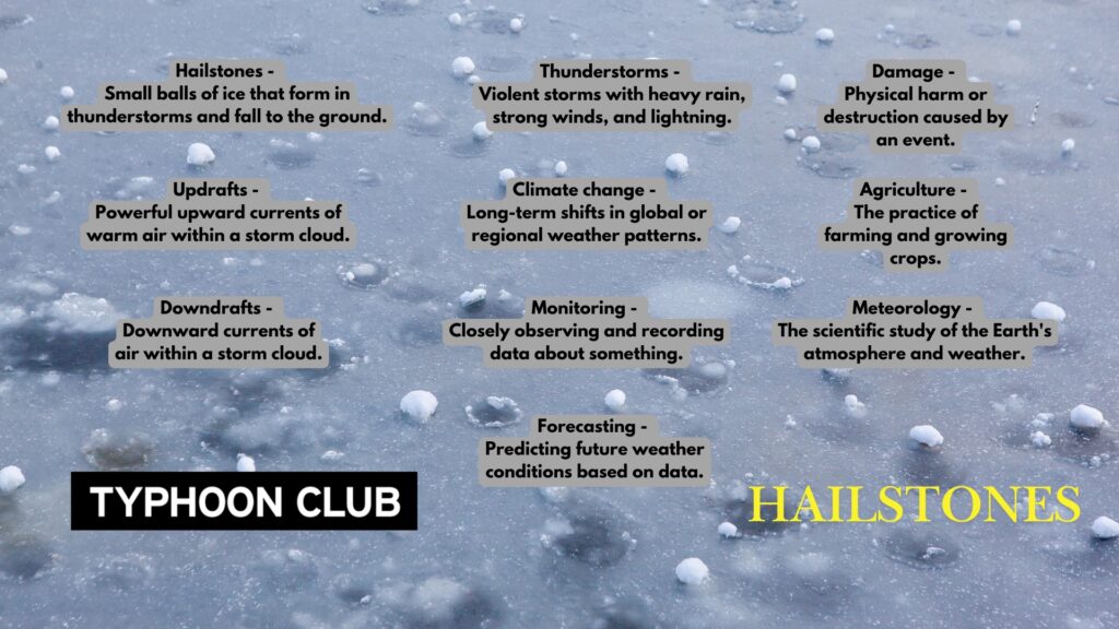 Hailstones are small balls of ice that form during thunderstorms and then fall to the ground. They are created when strong updrafts of warm air carry water droplets high up into the colder upper regions of a storm cloud. As these water droplets freeze, they form tiny balls of ice that then get swept back down by the downdrafts within the cloud.